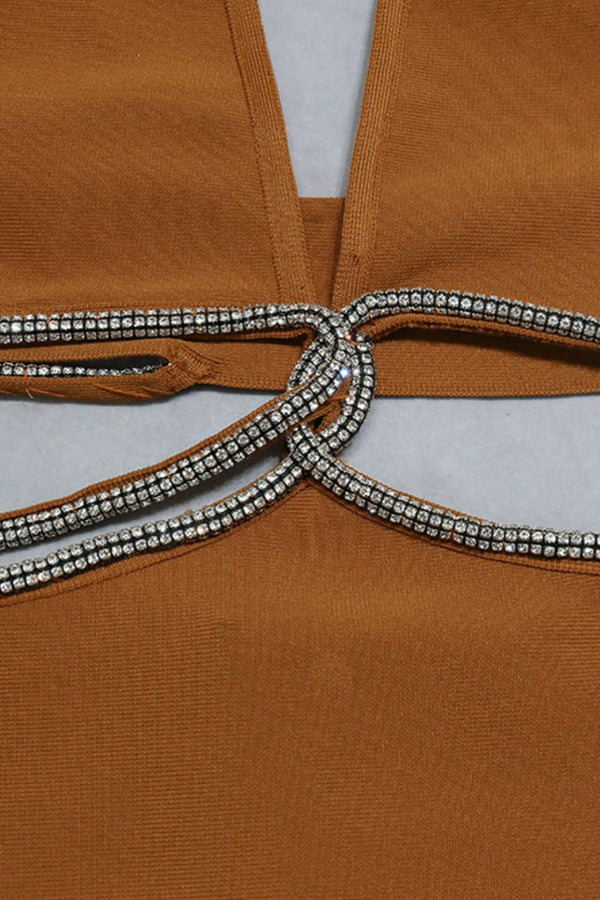 Rhinestone Halter Neck Cutout Slit Midi Dress