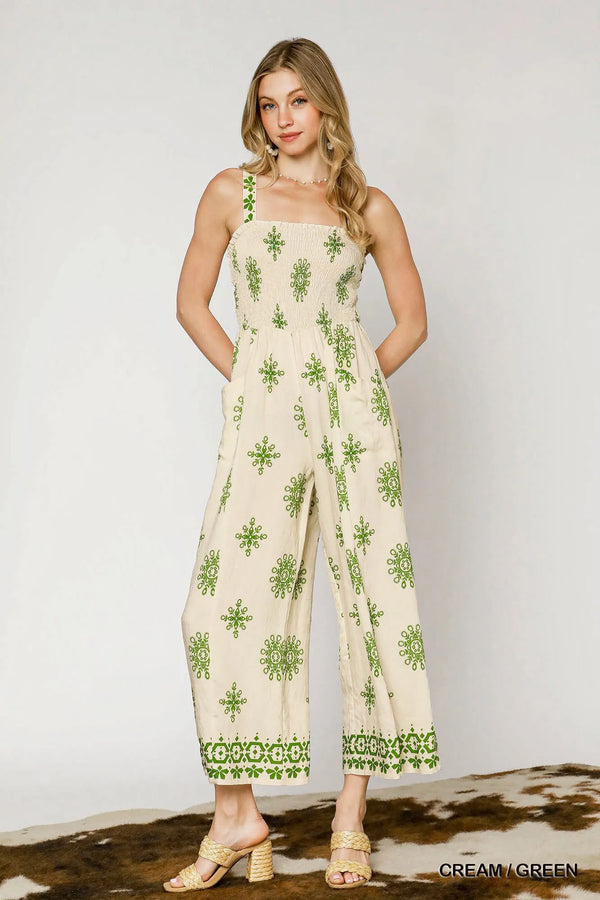 Umgee Smocked Printed Wide Leg Jumpsuit