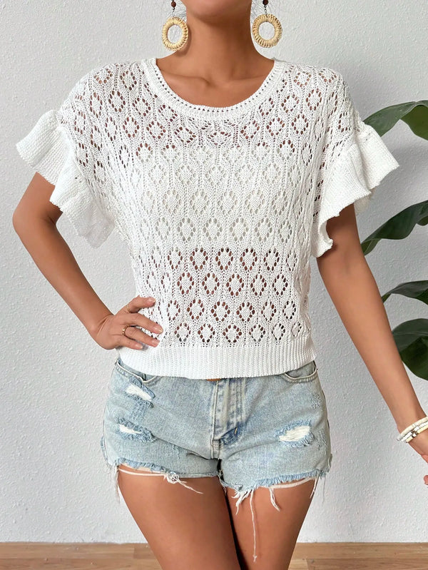 Ruffled Openwork Round Neck Knit Top