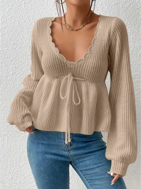 Scalloped V-Neck Drawstring Knit Top