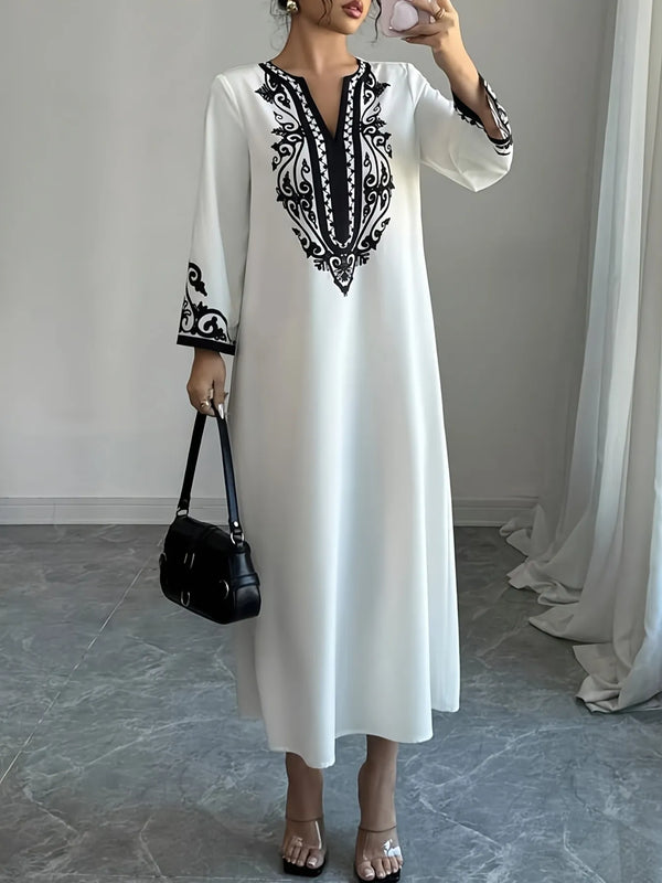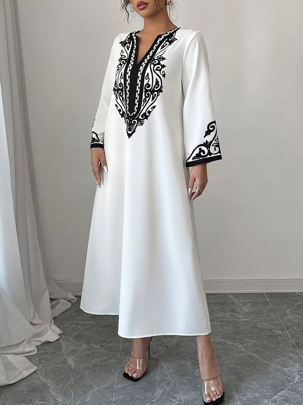 Printed Notched Long Sleeve Midi Dress