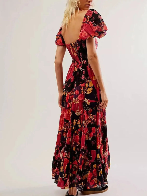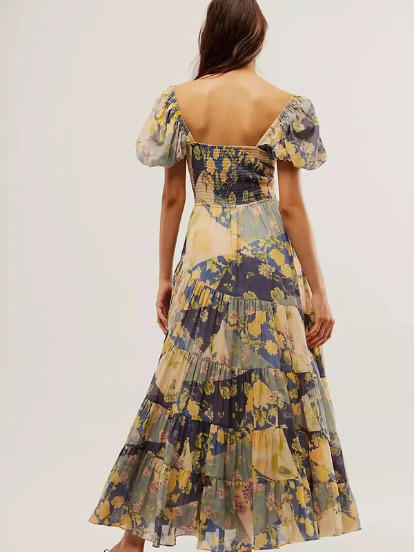 Printed Sweetheart Neck Puff Sleeve Maxi Dress