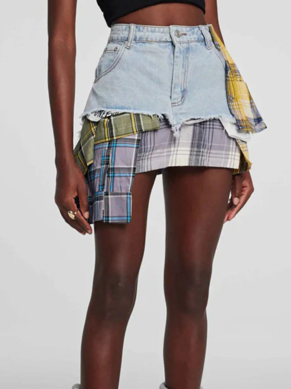 Raw Hem Denim Mini Skirt with Plaid Patch Details