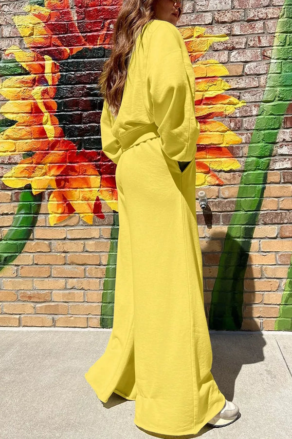 This stylish Round Neck Long Sleeve Sweatshirt and Pants Set features a vibrant yellow color that makes a bold fashion statement. The set includes a comfortable round neck sweatshirt with long sleeves and matching wide-leg pants, crafted from soft, breathable fabric blend perfect for all-day comfort. The oversized silhouette offers a relaxed, contemporary fit ideal for casual wear, lounging, or street style looks. The coordinated two-piece design ensures effortless styling while the bright yellow hue adds energy and warmth to any wardrobe. Perfect for women seeking comfort without compromising on style, this set combines practicality with fashion aesthetics.